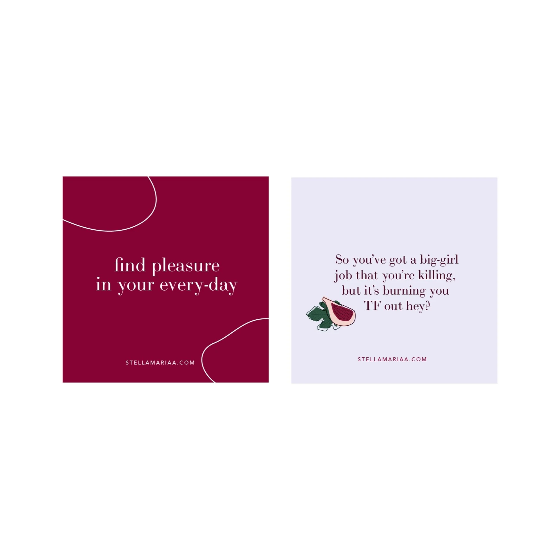 Stella Mariaa offers coaching for ambitious women. With sensuality coaching as part of the methodology, the inspiration for the brand identity needed to feel feminine and luxurious without being overly sexual. The fig played a key role here, helping us to develop the large colour palette that features reds, pinks and purples grounded with neutral green and brown.